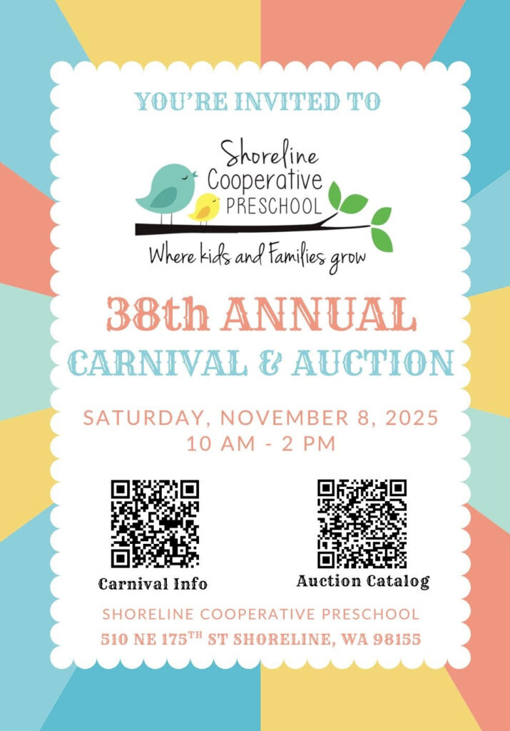 Our 38th Annual Silent Auction Fundraiser will go live on Saturday, November 8th at 10am and bidding will close on Tuesday, November 9th at 9 pm PST. Join us in person on the 8th at Shoreline Coop Preschool for our Carnival and join us for fun, games, and previews of our auction items.